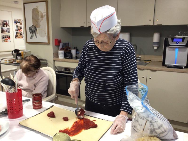Les résidentes de l'unité vie protégée se sont transformées en véritable pizzaiolo. Après avoir confectionné la pâte, elles se sont attaqués à la préparation de la garniture en découpant les tomates, olives, jambons... Avec l'aide de notre aide-soignante Mia.